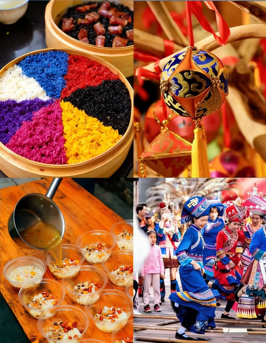 人々は歌うだけでなく、植物の汁で染めた五色のもち米を用意したり、刺繍入りのボールを投げたり、竹のポールダンスを踊ったり、銅太鼓を叩いたりして祝います。